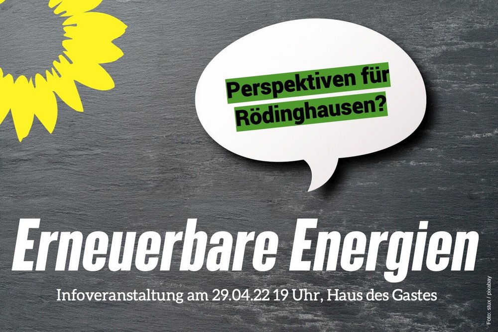 Der Ortsverband BÜNDNIS90/DIE GRÜNEN Rödinghausen lädt zum Thema " Erneuerbare Energien - Perspektiven für Rödinghausen?" ein. Am 29.04.2022 findet um 19.00 Uhr eine Infoveranstaltung im Haus des Gastes in Rödinghausen statt. Eingeladen sind zwei Referenten, Dipl. Ing. Klaus Meyer von Energie Impuls OWL, Netzwerk für Zukunftsenergien und Dr. Matthias Schreiber, Umweltforum Osnabrück + Umweltplanung Schreiber. Nach den Vorträgen ist ein Austausch mit den Referenten vorgesehen. Das Thema Erneuerbare Energien ist auch in Rödinghausen aktuell. Wir freuen uns auf viele Interessierte zu diesem Thema.